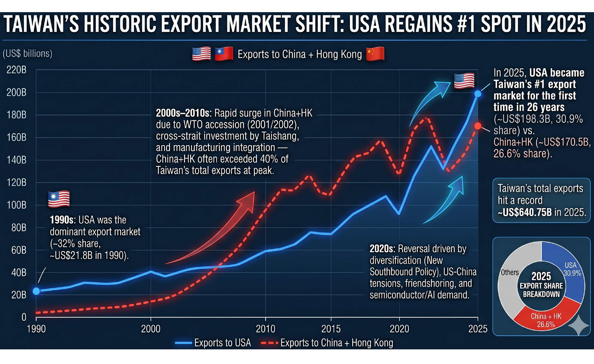 - The USA has overtaken China + Hong Kong to become Taiwan’s #1 export destination.