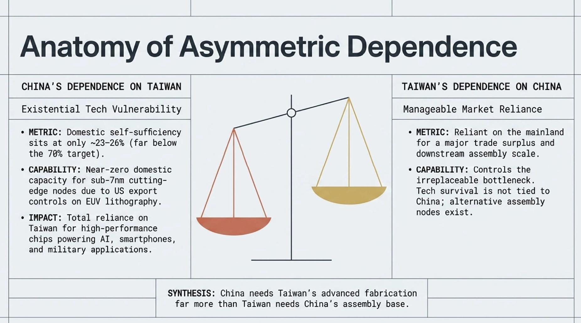 China is more dependent on Taiwan than vice versa. China relies on Taiwan’s high-tech components to power its low-cost assembly and export model. Taiwan, meanwhile, can increasingly redirect these exports to the U.S., Europe, and Japan — reducing its economic vulnerability.