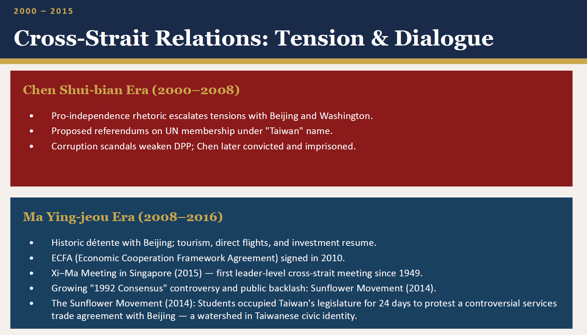 - DPP (Democratic Progressive Party): More pro-independence rhetoric; governed 2000–2008 and 2016–present. Cross-strait tensions higher during these periods.
