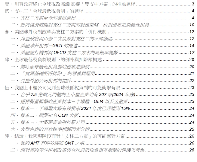 本研究以 OECD 推動的全球稅改協議中「支柱二方案(Pillar 2)」為主軸,並以美國川普二次執政後,單方面以自有境外稅制(GILTI 與 NCTI)與其他國家的全球最低稅負制(GMT)「並行」(side-by-side)為背景,分析全球最低稅負制的國際發展、法理架構及對台灣的潛在影響。