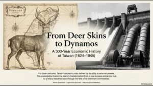 On the opening page, two images immediately set the tone of Taiwan’s economic history. On the right stands a sika deer, once abundant across the plains of Taiwan before the seventeenth century. On the left appears a hydraulic power dam, constructed during the Japanese colonial period to generate electricity and support heavy industry. These two images tell a powerful story. Within roughly three centuries—more precisely, within just over one hundred years of concentrated transformation—Taiwan moved from a landscape economy based on extraction to an industrial society equipped with modern infrastructure. The long interim period under early Qing rule, marked by limited state investment, explains why this transformation was delayed rather than continuous.