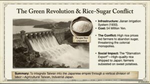 Agricultural production was reorganized to serve imperial needs. Sugar production was tightly controlled through regional monopolies, limiting farmers’ bargaining power but ensuring price stability. Rice cultivation was expanded and modernized through major irrigation projects, including the Wusanto Dam and the Chianan Irrigation System, then the largest in Asia.