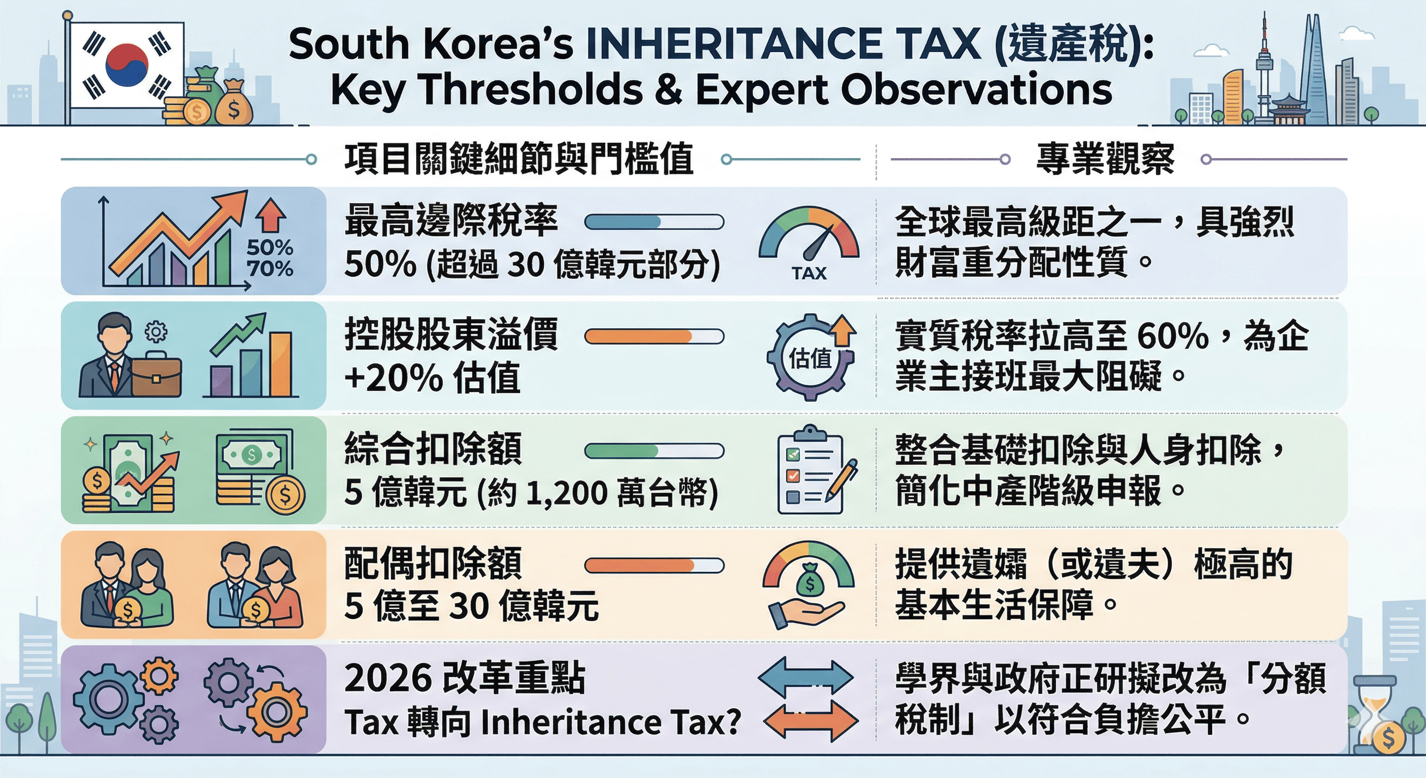 在稅率方面,韓國遺產稅分為五級超額累進稅率,最高邊際稅率高達50%(適用於超過30億韓元,約合6千萬台幣的部分),在OECD國家中僅次於日本的55%。但這還不是極限!針對大型企業集團(Chaebol),韓國稅法設有「最大股東附加課稅」制度:如果繼承的股份涉及公司經營權,其評估價值必須在市價基礎上額外加計20%的溢價。這項被稱為「大股東20%溢價懲罰性估值」的規定,直接將企業主的實質最高邊際稅率推升至驚人的60%,成為全球最高的實質稅率。